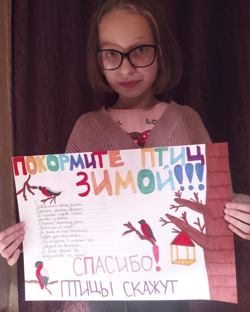 Андриянова Злата, ученица 4"В" класса принимает участие в экоконкурсе:"Накормим птиц зимой! "в номинации "стенгазета".