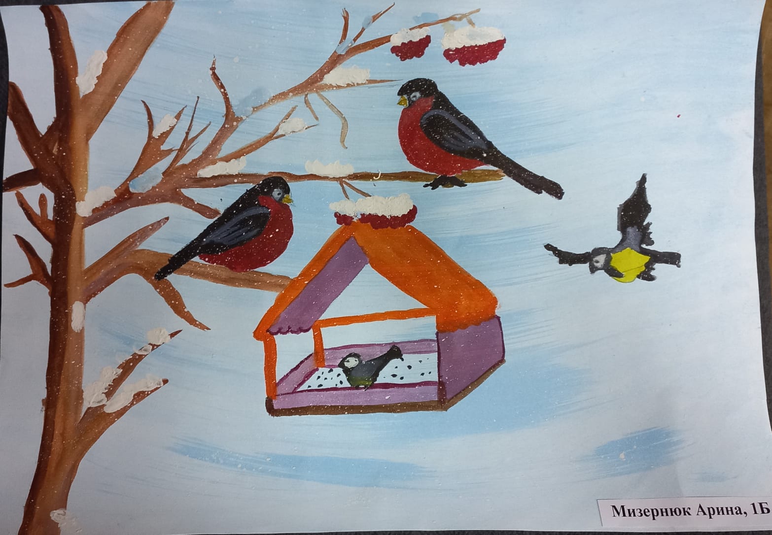 Мизернюк Арина, ученица 1 "Б" класса принимает участие в экоконкурсе:"Накормим птиц зимой!" в номинации "рисунок".