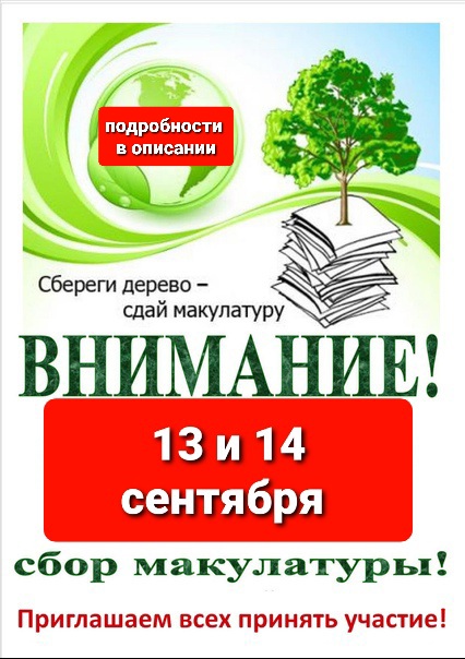 В нашей школе 13 и 14 сентября(ПОНЕДЕЛЬНИК и ВТОРНИК)будет проводиться сбор макулатуры!!! Акция :"Сбереги дерево-сдай макулатуру!"