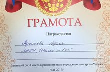 Поздравляем Архипову Аделю, ученицу 10А класса, занявшую I место в районном этапе городского конкурса "Ученик года-2019" (Руководитель - Сабирова В.С.).