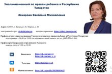 График личного приема граждан Уполномоченным по правам ребенка в Республике Татарстан: по вторникам с 14.00 до 18.00 (по предварительной записи по тел. (843) 236-61-64).График приема граждан сотрудниками Аппарата: каждую среду с 9.00 до 18.00.