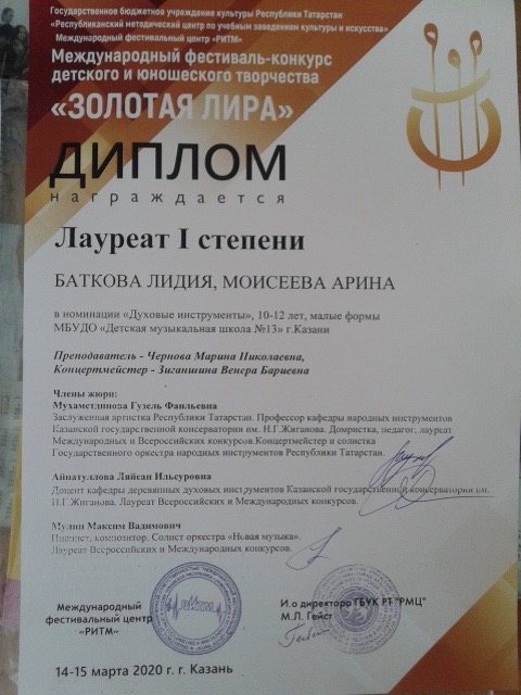Опубликовано: 14.03.2020Поздравляем Баткову Лидию и Моисееву Арину с победой в Международном фестивале - конкурсе детского и юношеского творчества "Золотая лира". Преподаватель - Чернова Марина Николаевна, концертмейстер - Зиганшина Венера Бариевна. Желаем дальнейших успехов.