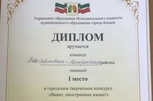 19 апреля прошёл городской творческий конкурс среди учителей английского языка "Виват, иностранные языки!". Команда Ново-Савиновского и Авиастроительного районов заняла первое место и была награждена дипломом первой степени. Среди участников команды была и учительница нашей школы Новикова Татьяна Валерьевна.
