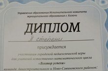 Команда учителей Авиастроительного и Ново-Савиновского районов "Sam@let" в составе: Мубаракшина Светлана Рашидовна (учитель физики), Старожилова Светлана Владимировна (учитель географии, Школа №143), Романова Ирина Анатольевна (учитель химии, Школа №146), Сагитова Айгуль Азатовна (учитель биологии), Хабибуллина Лилия Евгеньевна (учитель математики, Школа №119), получила диплом II степени. Так держать! Желаем успехов в дальнейшей работе!