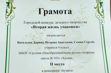 Поздравляем учеников 4Б класса: Васильеву Дарину, Петрову Анастасию, Семина Сергея и руководителя Мустафину Р.Р. с призовым 2 местом в городском конкурсе детского творчества "Вторая жизнь упаковки 2018" в номинации "Бумага"!
