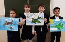 Учащиеся 3г класса Бояршинов Максим, Бидзюра Макар-Варвара, Фаткуллова Сабина, Бакиев Ясин(кл.рук.Сулайманова Д.А) приняли участие в городском конкурсе рисунков "Казанский авиационный завод. Люди, судьбы".