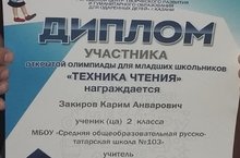 Ученик 2а класса Закиров Карим( кл.рук.Фатыхова Л.И.)участвовал в очной олимпиаде " Техника чтения" при Городском центре творческого развития и гуманитарного образования для одаренных детей г. Казани
