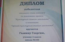 Ученик 3б класса Галкин Георгий (кл.рук. Мухина Н.В.) награждён дипломом победителя школьного этапа республиканского конкурса по реализации проекта "Культурный дневник школьника" в номинации "Лучший культурный дневник школьника". Поздравляем!