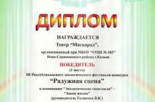Театральный коллектив «Маскарад» (рук. Голикова В.К.) с победой в III Республиканском экологическом фестивале-конкурсе «Радужная сцена» в номинации «Экологические спектакли». Желаем им дальнейших творческих побед!!!!!!!!