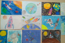 Учащиеся 2б класса подготовили рисунки к выставке, посвященной Дню космонавтики.