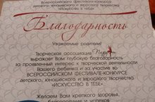 Родители учениц 2 А класса Власовой С., Бочковой Д., Лобачевой И., Германовой К., Плешковой Насти получили благодарности от творческой ассоциации «Пируэт» за проявленный интерес к творческой деятельности их детей.