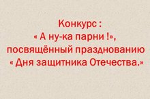 Уважаемые классные руководители и ребята 9-11 классов, спешим сообщить, что 25 февраля в 13.10 состоится конкурсная программа "А ну-ка, парни!", посвященное Дню защитников Отечества! От каждого класса просьба подготовить команду из 7 ребят. Этапы мероприятия: