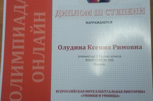 Поздравляем ученицу 2в класса Олудину Ксению(кл. рук-ль: Андреева М. В.). Она награждена Дипломом 3 степени во Всероссийской интеллектуальной викторине "Умники и умницы". -