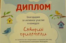Ученик 2 В класса Шестериков Алексей (класс. рук-ль: Валиуллина Э.А.) принял активное участие в республиканском конкурсе «Скворцы прилетели», организованного компанией «Максидом» при участии Министерства экологии и природных ресурсов Республики Татарстан. За строительство кормушки Алексей был награждён Дипломом.