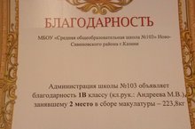 Поздравляем учащихся1в класса (кл.рук-ль:Андреева М.,В.) занявших 2 место в школе по сбору макулатуры!
