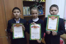 Ученики 4Т класса Сабиров Тимур,Хамидуллина Азалия, Файзиев Салим (кл.рук. Гайнуллина А. М.)администрацией школы награждены грамотами в номинации "Самая объёмная информационная газета-кроссворд" на тему:"Правила дорожного движения". Поздравляем ребят!