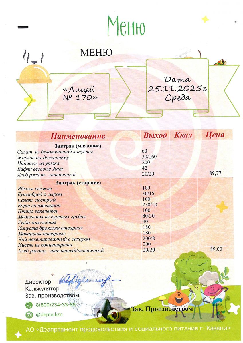 МЕНЮ разрабатывается и определяется на 2 недели АО «Департамент продовольствия и социального питания г.Казани».