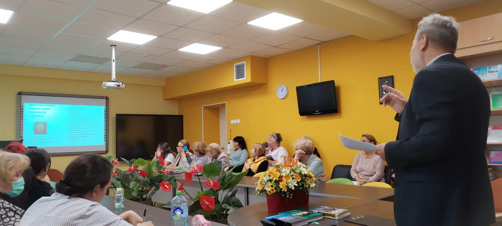 Опубликовано: 24.09.202424.09.2024 года в ГАПОУ «Международный колледж сервиса» прошло заседание Школы педагога с темой «Методология написания научно-практической статьи» в рамках подготовки к республиканской конференции «Профессионалитет, как практикоориентированный проект для объединения инструментов обучения студентов в рамках отраслевого кластера». Лекцию вел преподаватель колледжа, автор книг, к.п.н., доцент социальной философии, Алексей Ефимович Шишкин. На заседании с педагогами подробно изучали основные компоненты написания статьи, разобрали как формируется тема и раскрывается содержание работы.