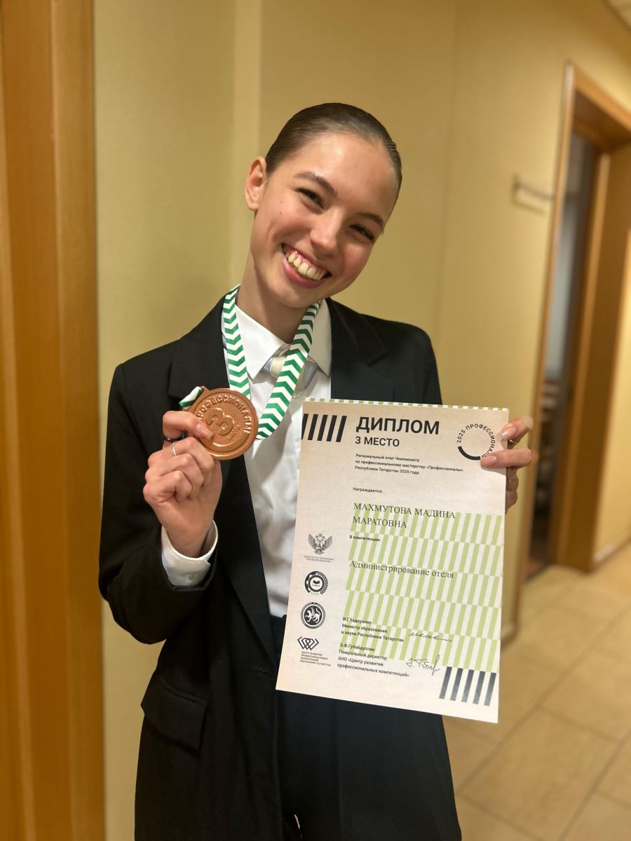 По результатам конкурсных дней наш студент завоевала БРОНЗОВУЮ медаль Регионального этапа чемпионата “Профессионалы”. Искренне поздравляем Мадину и ее наставника Арину Артемовну, и хотим от души пожелать вашему тандему расти дальше, покорять новые вершины и добиваться побед! Молодцы! Гордимся Вами!