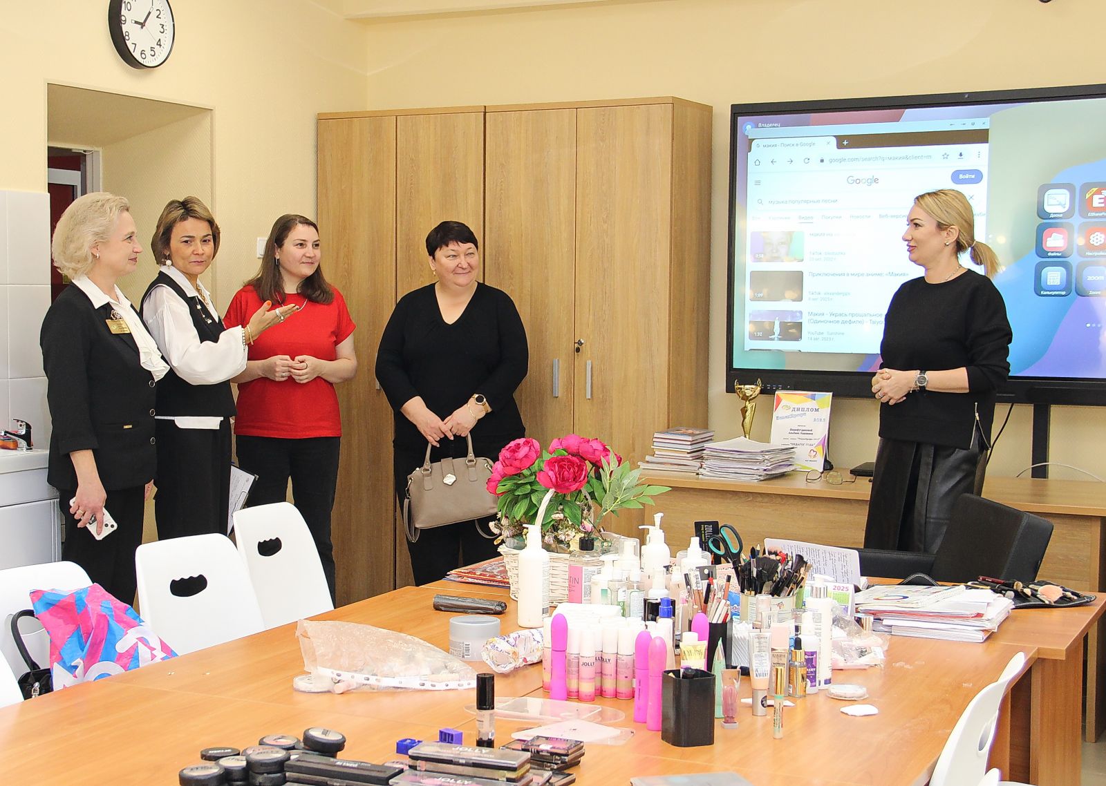 Опубликовано: 04.11.2025В рамках мероприятий по реализации федерального проекта «Профессионалитет» 1 ноября 2025 года в Международном колледже сервиса состоялась встреча с кураторами проекта, представителями Института развития образования Российской Федерации Варламовой Татьяной Андреевной, Дерибиной Татьяной Валерьевной и исполняющим обязанности заместителя министра образования и науки Республики Татарстан Федоровым Андреем Александровичем. Гости посетили современные лаборатории, в которых студенты отрабатывают свои умения и навыки по разным направлениям подготовки: