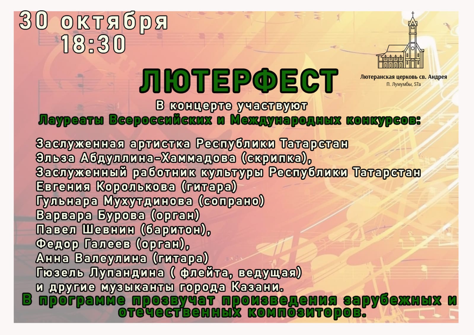 Преподаватель ДМШ №11 Гузель Борисовна Лупандина примет участие в музыкальном вечере, организованном правлением лютеранской церкви св. апостола Андрея. На концерт приглашаются все любители камерной музыки.