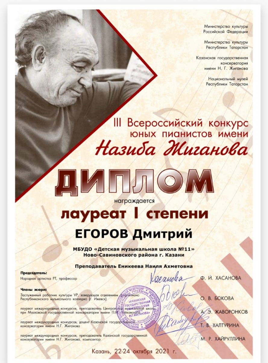 Учащийся ДМШ №11 Дмитрий Егоров (класс фортепиано, преподаватель Наиля Ахметовна Еникеева) стал Лауреатом 1 степени III Всероссийского конкурса юных пианистов имени Назиба Жиганова.