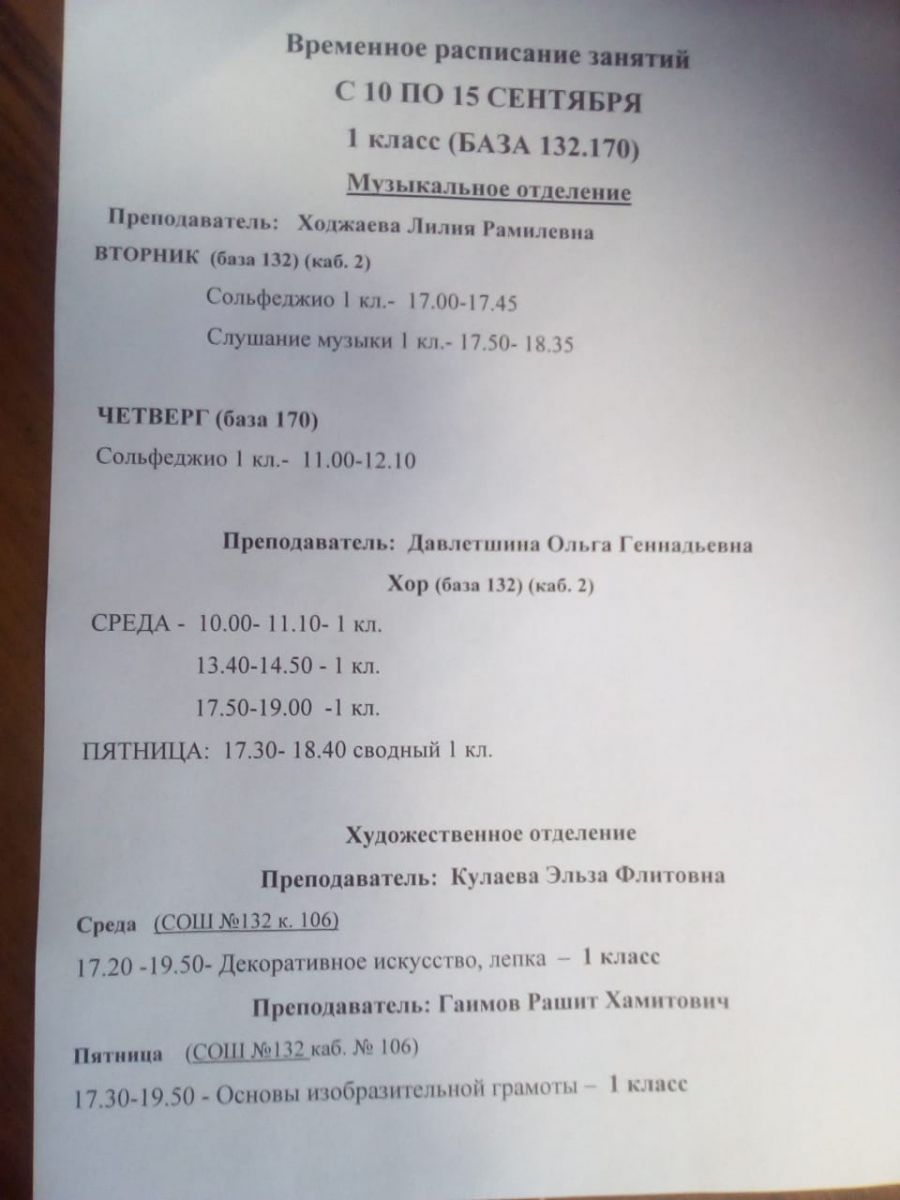 Временное расписание занятий ДМШ № 11 (СШ 132) с 10 по 15 сентября