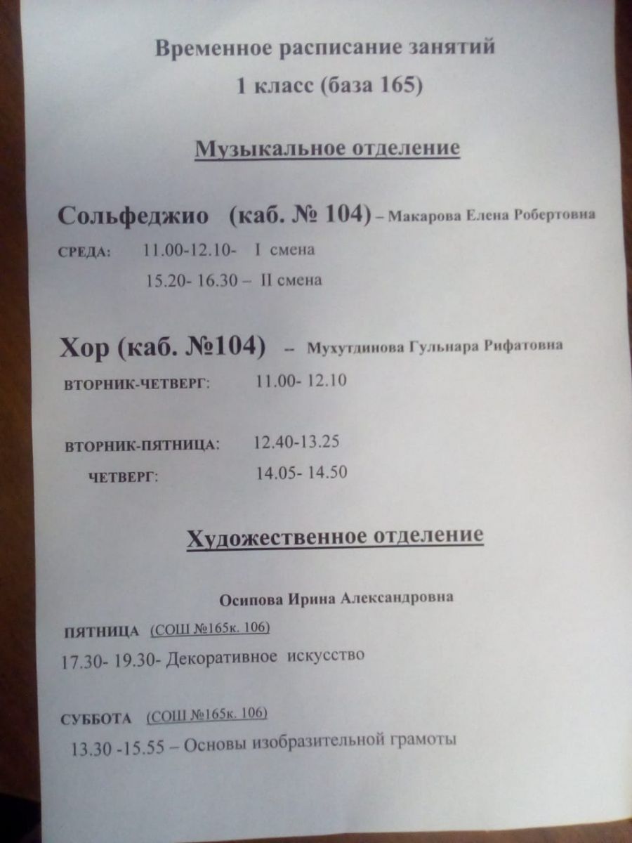 Временное расписание занятий ДМШ № 11 (СШ 38 и 165) с 10 по 15 сентября