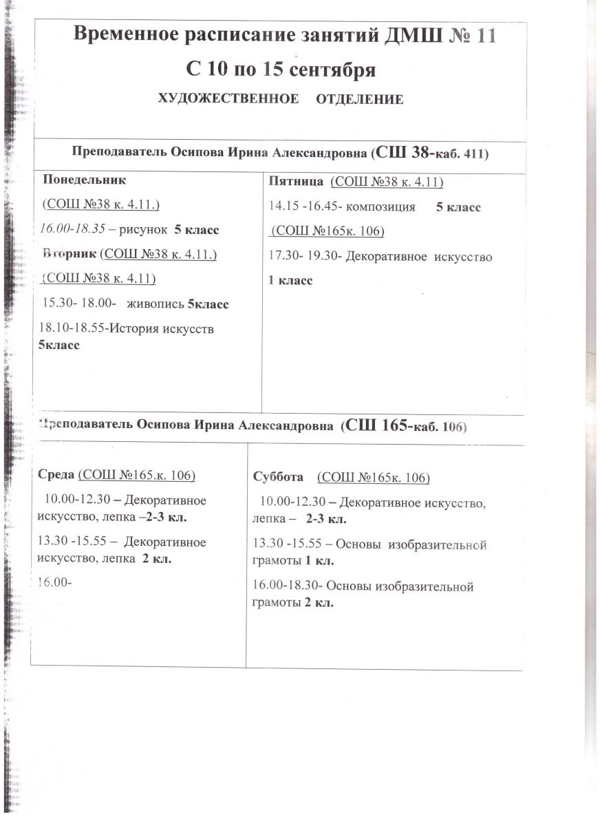 Временное расписание занятий ДМШ № 11 с 10-15 сентября Художественное отделение 11.09.2018