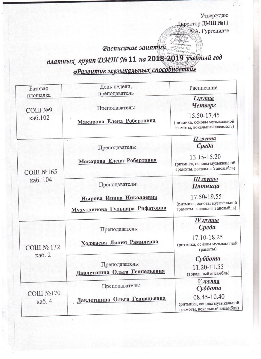 РАСПИСАНИЕ ЗАНЯТИЙ ПЛАТНЫХ ГРУПП ДМШ №11 2018-2019 уч. год Развитие музыкальных способностей
