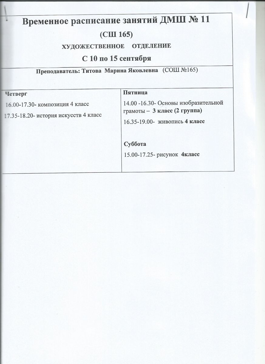 Временное расписание занятий ДМШ № 11 (165) с 10 по 15 сентября Титовой М,Я
