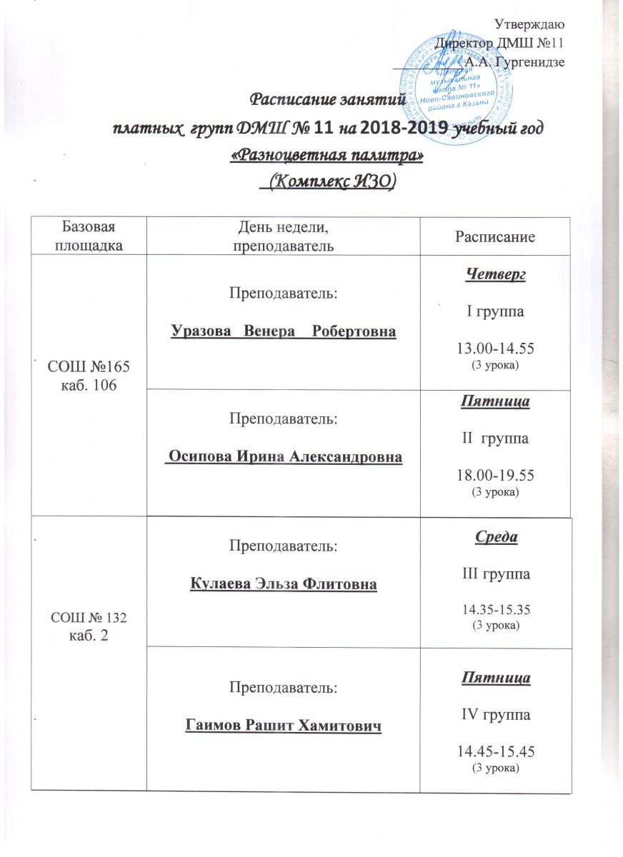 РАСПИСАНИЕ ЗАНЯТИЙ ПЛАТНЫХ ГРУПП ДМШ №11 2018-2019 уч. год COШ 165 и СОШ132 15.09.2018