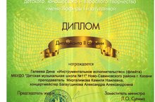 Поздравляем Галееву Дину, класс преподавателя Миргалимовой К.Н., концертмейстер Багаутдинова А.А., с победой в V Открытом республиканском конкурс е детского, юношескогои взрослого творчества именм Вафиры Гизатуллиной - дипломант II степени.