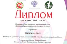20 мая на международном фестивале Форсаж Бубнова Алиса, учащаяся класса преподавателя Лядовой Оксаны Юрьевны стала Дипломантом II степени. Поздравляем А, Оксану Юрьевну и концертмейстера Диляру Фаритовну Низамутдинову. Желаем Алисе дальнейшего творческого роста и новых успехов!