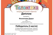 Поздравлем с победой Филиппову Дарью, класс преподавателя Мухутдиновой Гульнары Рифатовны, концертмейстер Кукарова Л.А.!