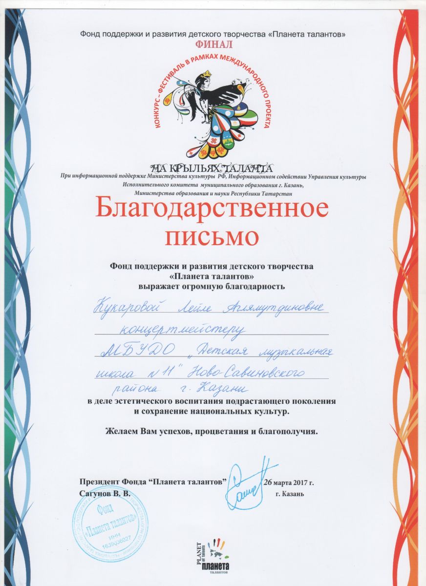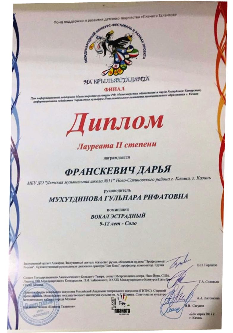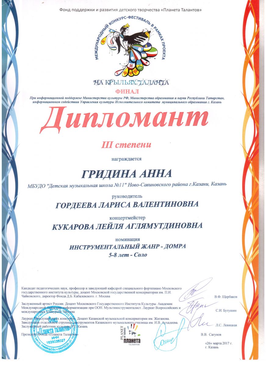 Опубликовано: 27.03.2017Поздравляем победителей финального этапа международного конкурса - фестиваля "На крыльях таланта", проходившего 24 и 25 марта в г. Казани. Гридина Анна (домра) – Диплом III степени (класс преподавателя Гордеевой Л.В, концертмейстер Кукарова Л.А.);