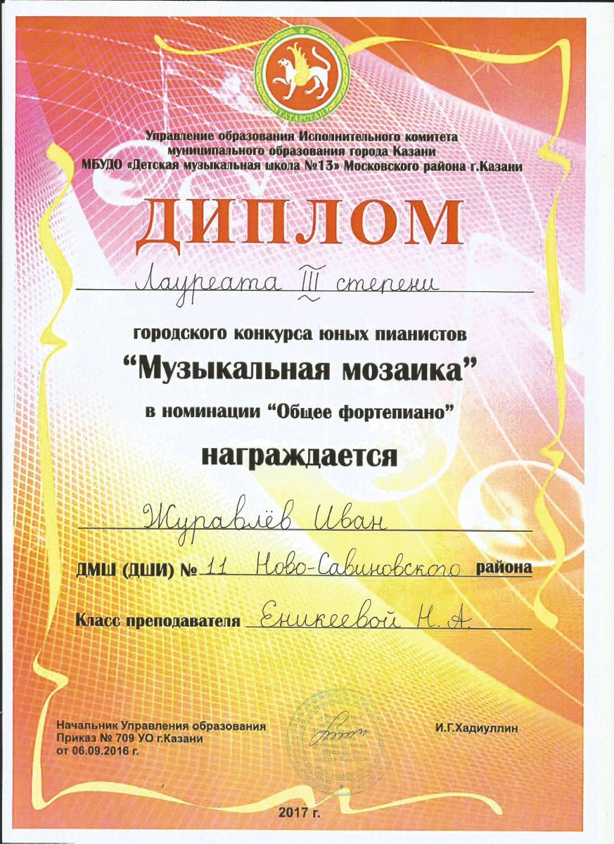 Журавлев Иван Лауреат III степени преподаватель Наиля Ахметовна Еникеева