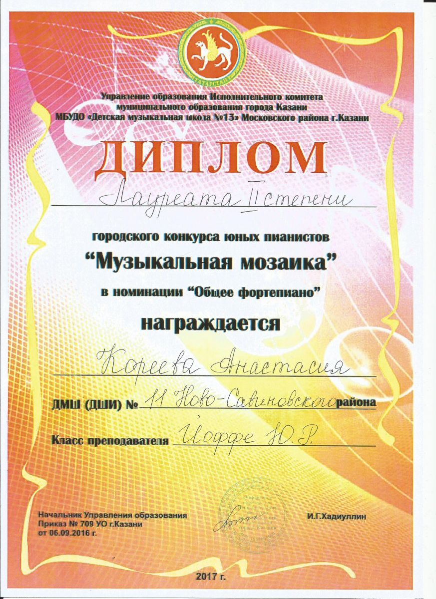 Кореева Анастасия Лауреат II степени преподаватель Юлия Романовна Иоффе