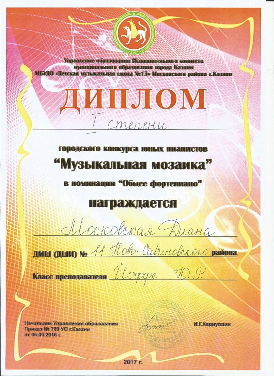 Московская Диана Дипломант I степени преподаватель Юлия Романовна Иоффе