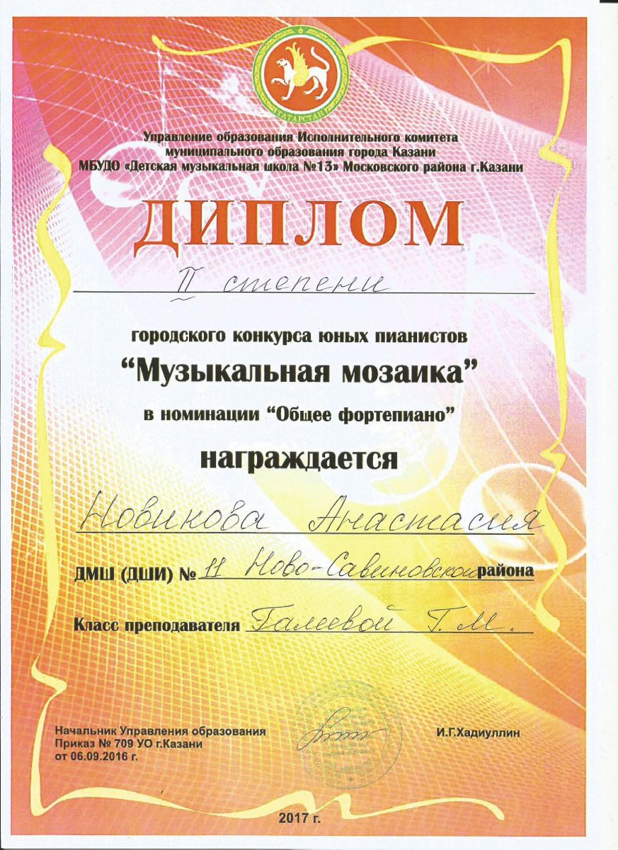 Новикова Анастасия Дипломант II степени преподаватель Гузаль Мухаметзиевна Галеева
