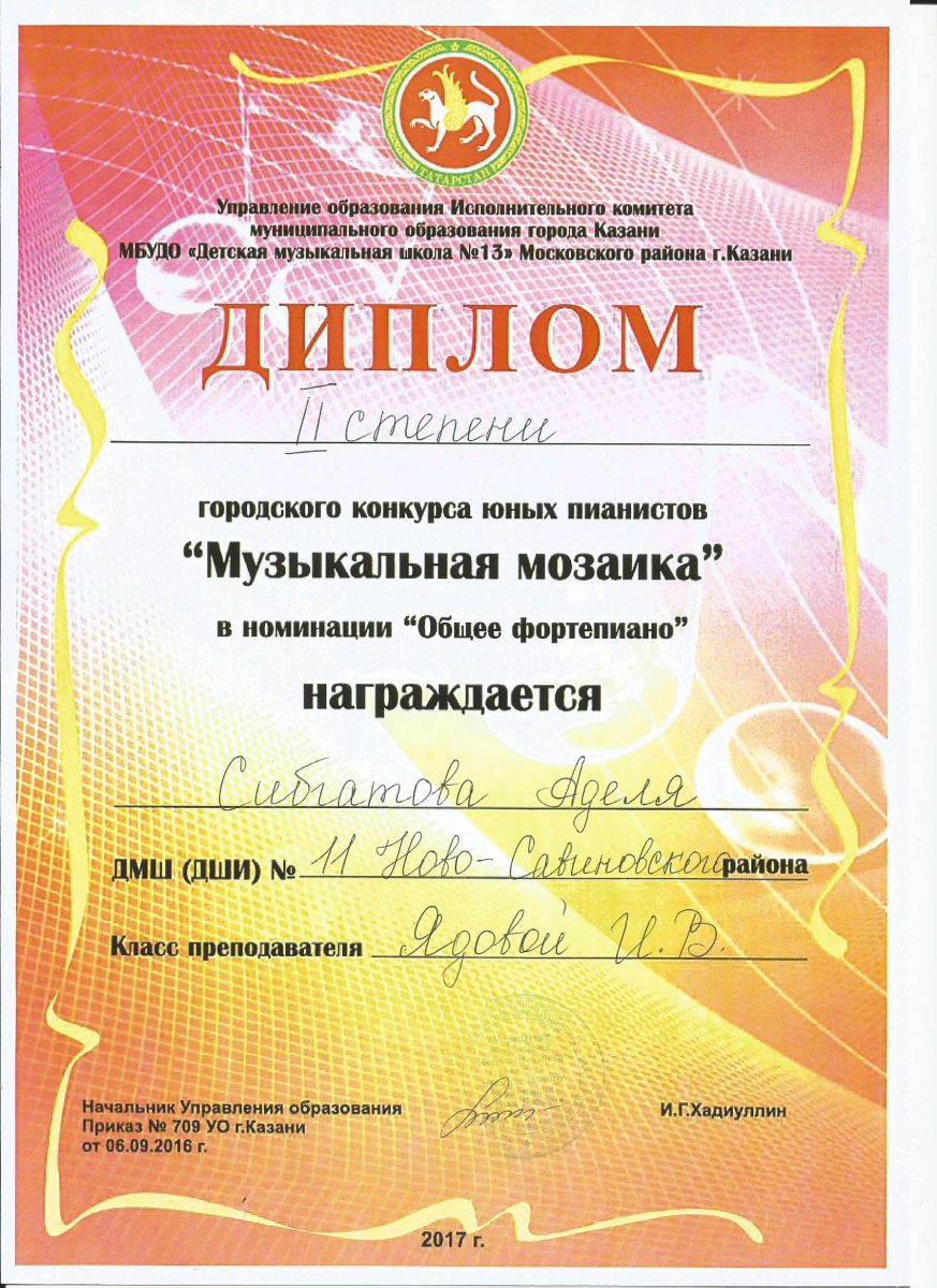 Сибгатова Аделя Дипломант II степени преподаватель Ирина Вячеславовна Ядова