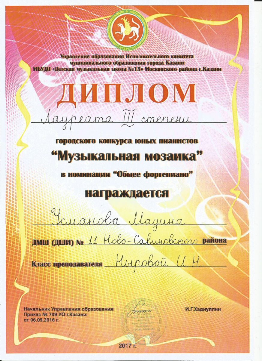 Усманова Мадина Лауреат III степени преподаватель Нырова Ирина Николаевна