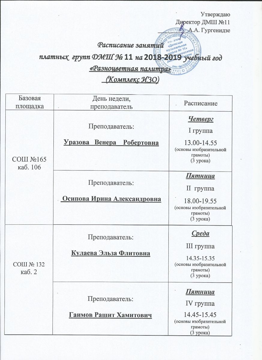 Опубликовано: 15.09.2018РАСПИСАНИЕ ЗАНЯТИЙ ПЛАТНЫХ ГРУПП ДМШ №11 2018-2019 уч. год Разноцветная палитра