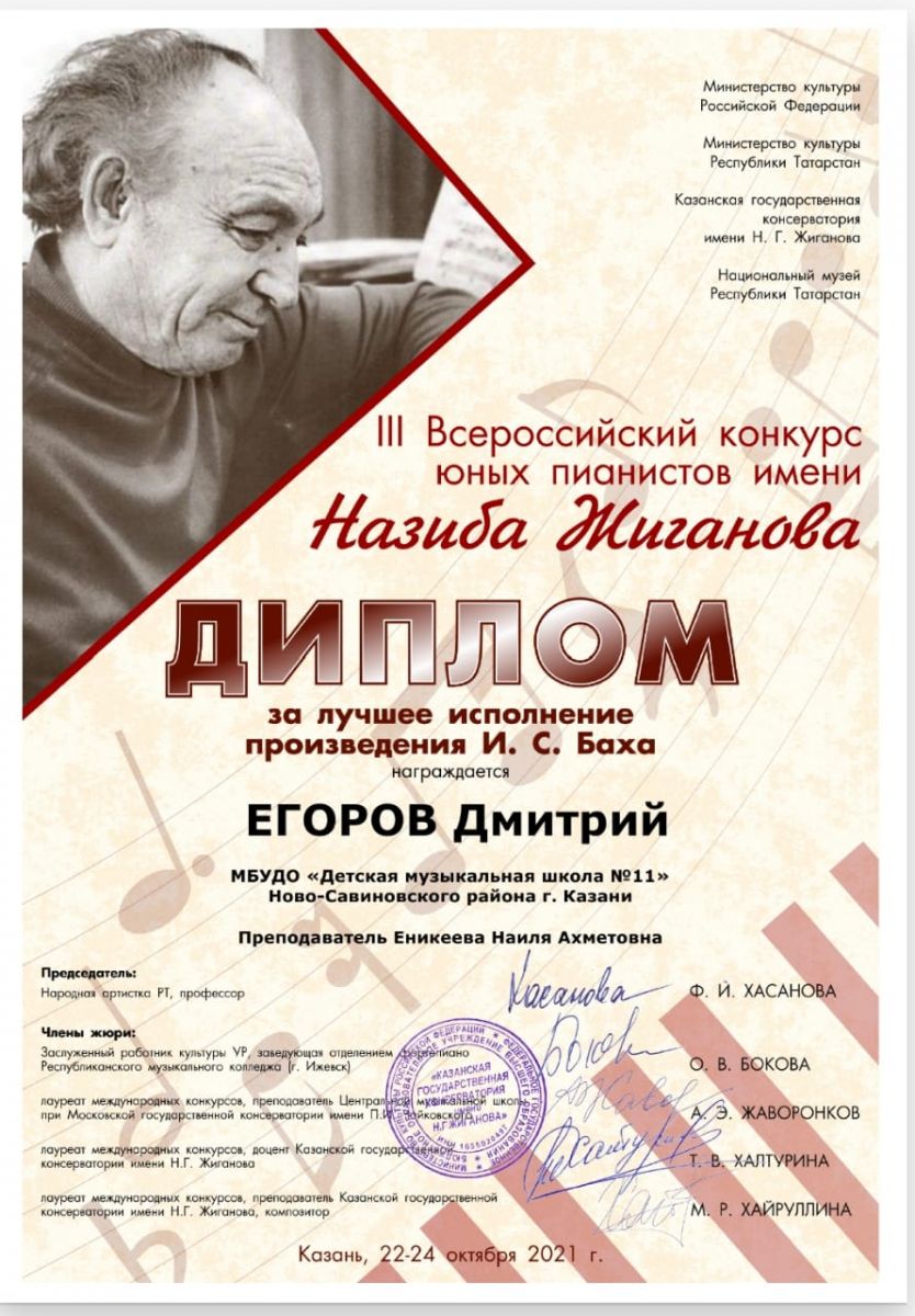 Опубликовано: 08.11.2021Учащийся ДМШ №11 Дмитрий Егоров (класс фортепиано, преподаватель Наиля Ахметовна Еникеева) стал Лауреатом 1 степени III Всероссийского конкурса юных пианистов имени Назиба Жиганова.
