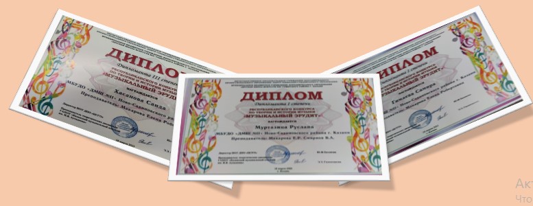 Неделей раньше ученики Е.Р. Макаровой и В.А. Смирнова приняли участие в другом конкурсе по музыкально-теоретическим дисциплинам республиканского уровня. В ДШИ №6 Советского района в олимпиаде по истории и теории музыки «Музыкальный эрудит» Хасанова Саида, Гимаева Самира и Муртазина Руслана заработали звания Дипломантов I-III степеней.