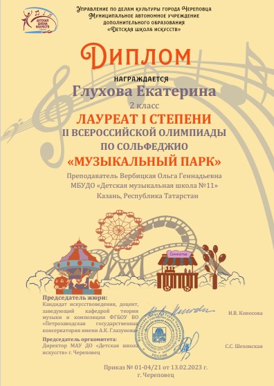А ещё раньше, в феврале, ученица 2 класса Глухова Катя стала Лауреатом I степени II Всероссийской олимпиады по сольфеджио «Музыкальный парк» (преподаватель О.Г. Вербицкая).