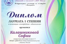Поздравляем с успешным выступлением на Международной олимпиаде по слушанию музыки "Музыкальный калейдоскоп" с дипломом ГРАН-ПРИ Калистратову Дарину. Преподаватель Шестопалова Александра Венальевна. Желаем дальнейших успехов!