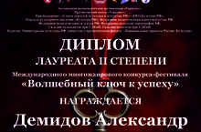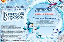 Поздравляем с успешным выступлением на Международном творческом конкурсе "В гостях у Сказки" Демидова Александра - Лауреата 2 степени в номинации "Инструментальное исполнительство", руководитель Дерябина Елизавета Андреевна, концертмейстер Ямалеева Анжела Явдатовна.