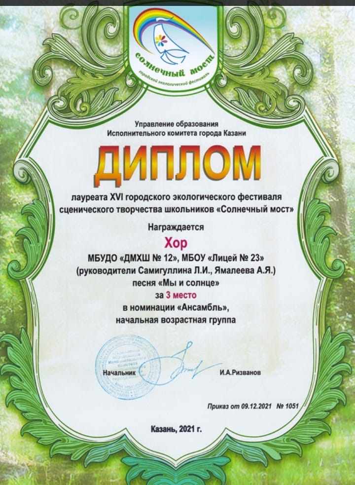 - Младший хор - Лауреатов 3 степени (преподаватель Самигуллина Л.И., концертмейстер Ямалеева А.Я)
