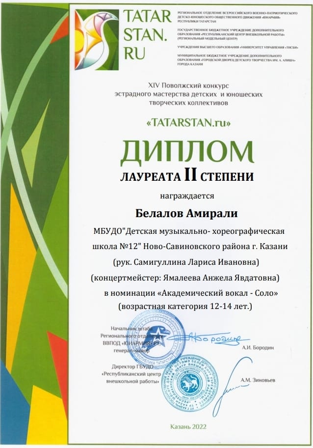 Поздравляем с успешным выступлением на Межрегиональном фестиваль-конкурсе детсского, юношеского и взрослого творчества "Время искусства":- Белалова Амирали - Лауреата 1 степени (преподаватель Самигуллина Л.И, концертмейстер Ямалеева А.Я.)